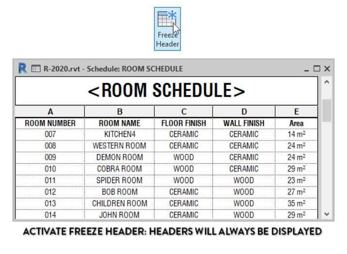 บางครั้งการที่เรามีตารางยาวๆใน Revit อาจทำให้เรามีปัญหาเมื่อใช้ Scroll mouse เลื่อนลงไปดูข้อมูลในแถวล่างๆ เพราะเราจะมองไม่เห็นว่าแต่ละคอลัมน์คือคอลัมน์อะไร ฟังก์ชั่นใหม่นี้ จะเหมือนกับที่เรา Freeze Header ใน excel เลยครับ ทำให้สะดวกมากขึ้นในการใช้งานครับ