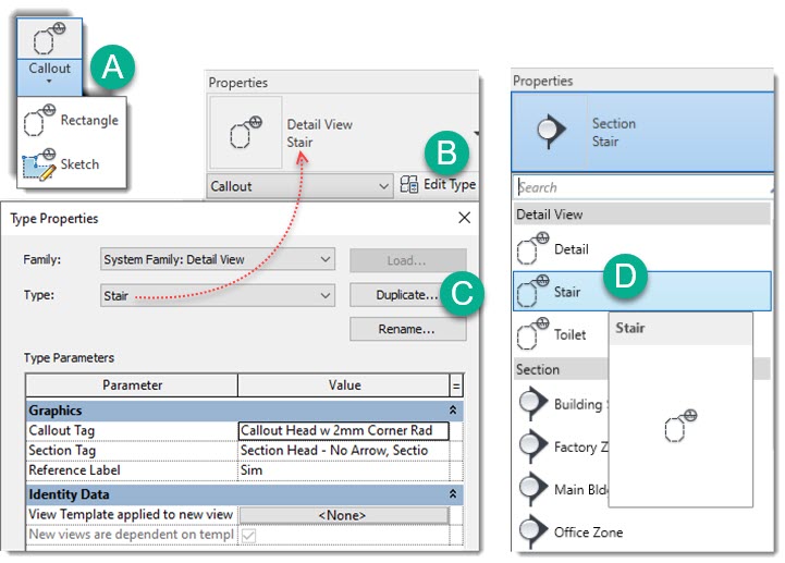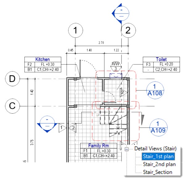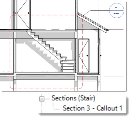 Callout : เมื่อใดที่ใช้คำสั่งนี้จะเกิดวิวขึ้นมาทันที ซึ่งมีอยู่ 2 ตัวเลือก ถ้าเลือกเป็น Section (ขั้นตอน a. เลือกตัวเลือก Section / Edit Type / Duplicate แล้วตั้งชื่อเป็นส่วนของงานเช่นนั้นๆ เช่น Stair, Toilet หรืออย่างอื่นๆ b. คลิกครอบชิ้นส่วนงาน) เมื่อทำตามขั้นตอนจนเสร็จ ที่ Project Browser ก็จะเกิดวิวนี้ขึ้นมาทังที ดังรูปผั่งขวานี้